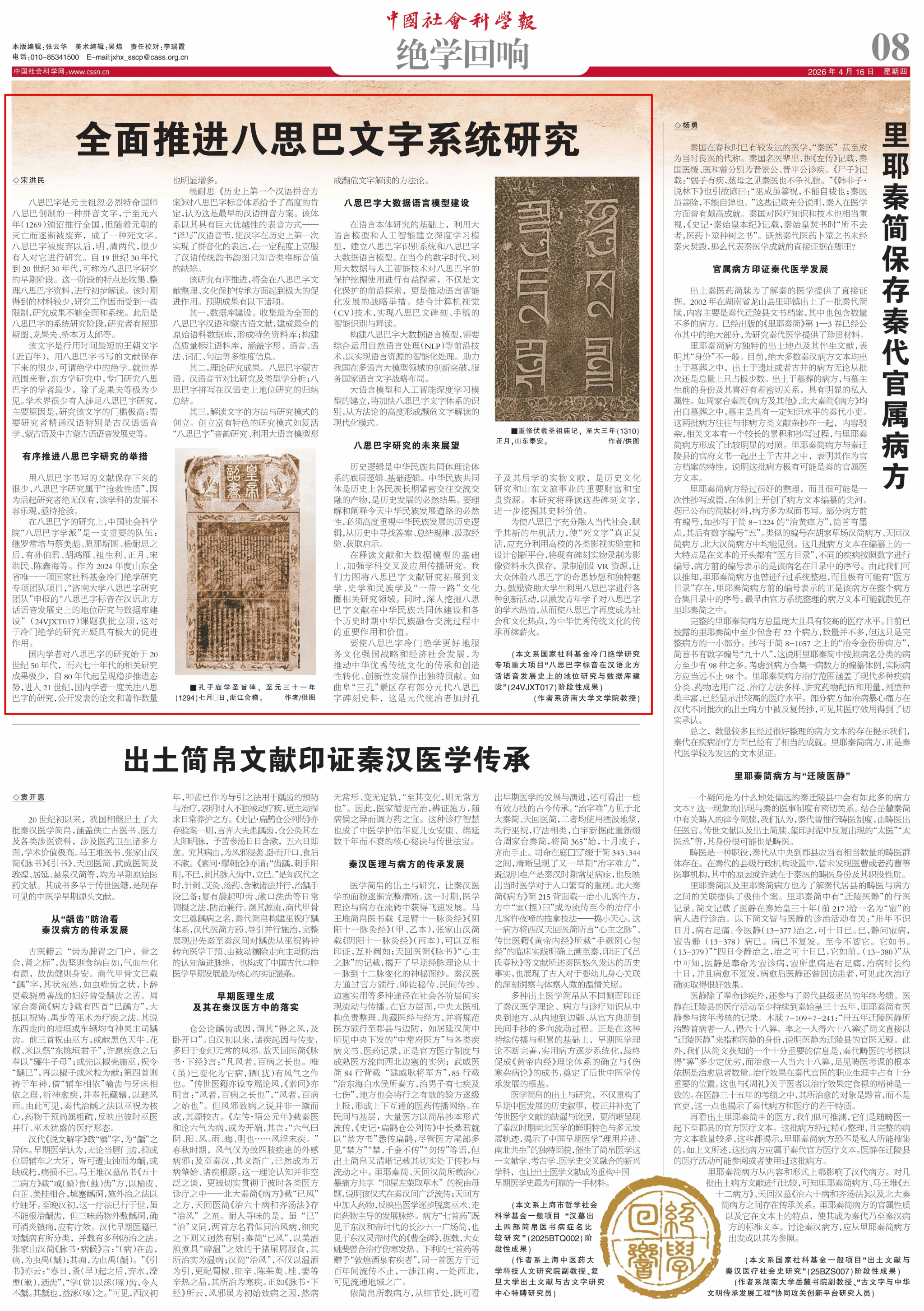 宋洪民教授继2023年12月14日发表文章《照那斯图的八思巴字与蒙汉语言接触研究》后,于2026年4月16日在《中国社会科学报》再次刊发文章《全面推进八思巴文字系统研究》。文章立足团队研究实践,系统梳理了我国八思巴字研究的历史脉络与前沿进展。