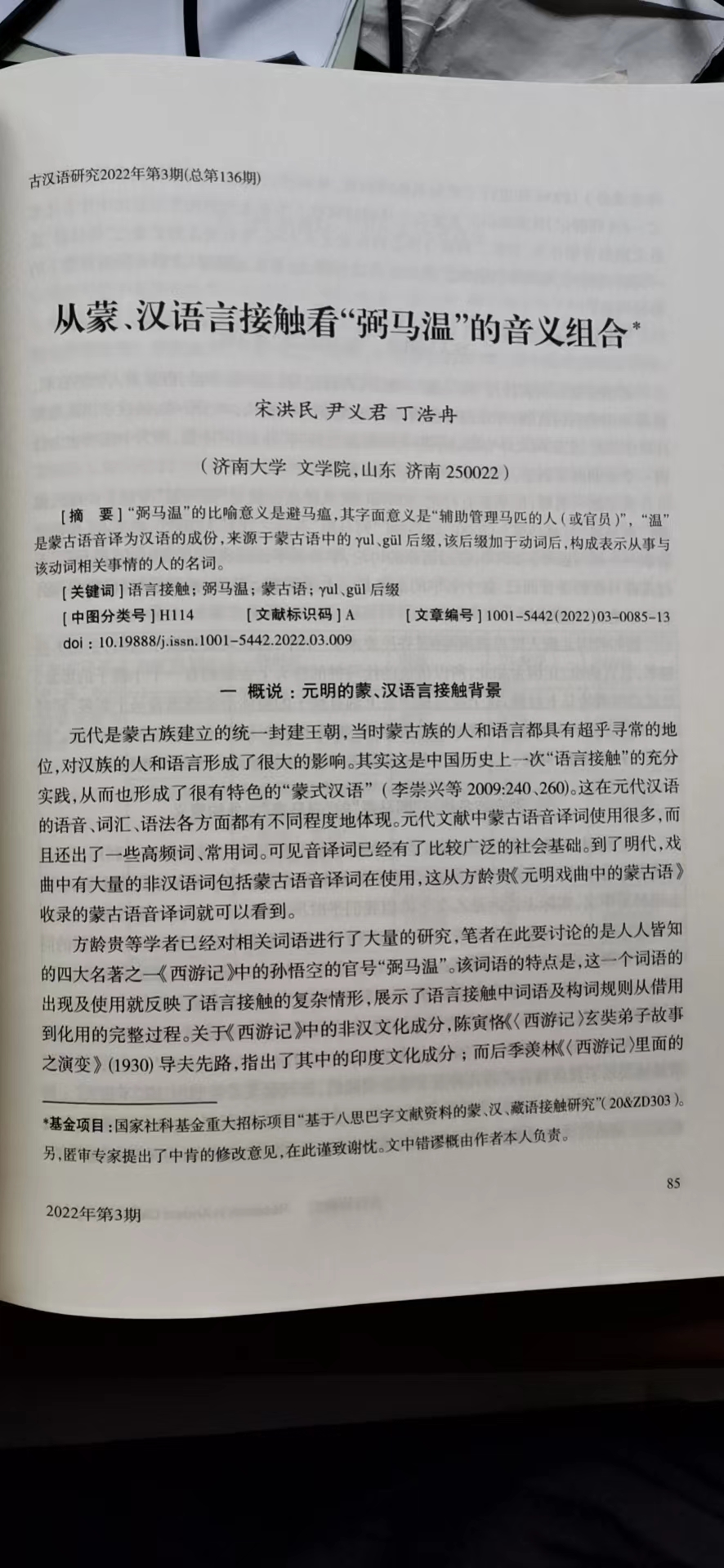 捷克论坛汉语言文字学学科方向带头人宋洪民教授,在《古汉语研究》(CSSCI)2022年第3期(总第136期)发表学术论文,《从蒙、汉语言接触看“弼马温”的音义组合》,本课题为宋教授主持的国家社科基金重大招标项目“基于八思巴字文献资料的蒙、汉、藏语接触研究”(项目编号:20&ZD303)阶段性成果。