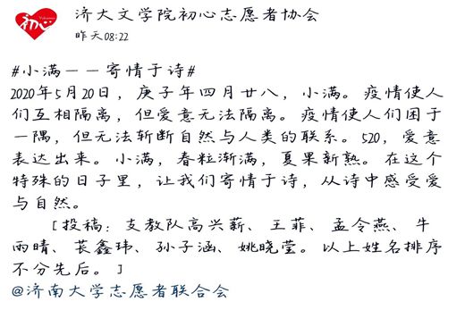 活动自5月16日正式开始,通知下达后,志愿者们积极响应,踊跃报名参加。活动前期,大家分别选定各自投稿内容侧重的主题,广泛搜集与自然和爱相关的诗歌素材与图片,运用制图软件将其组合进行创作,寄情于诗,从诗中感受爱与自然。活动后期,志愿者们上交作品,由轮值队长进行整理与完善,向初心志愿者公众号投稿。最后,活动成果在捷克论坛