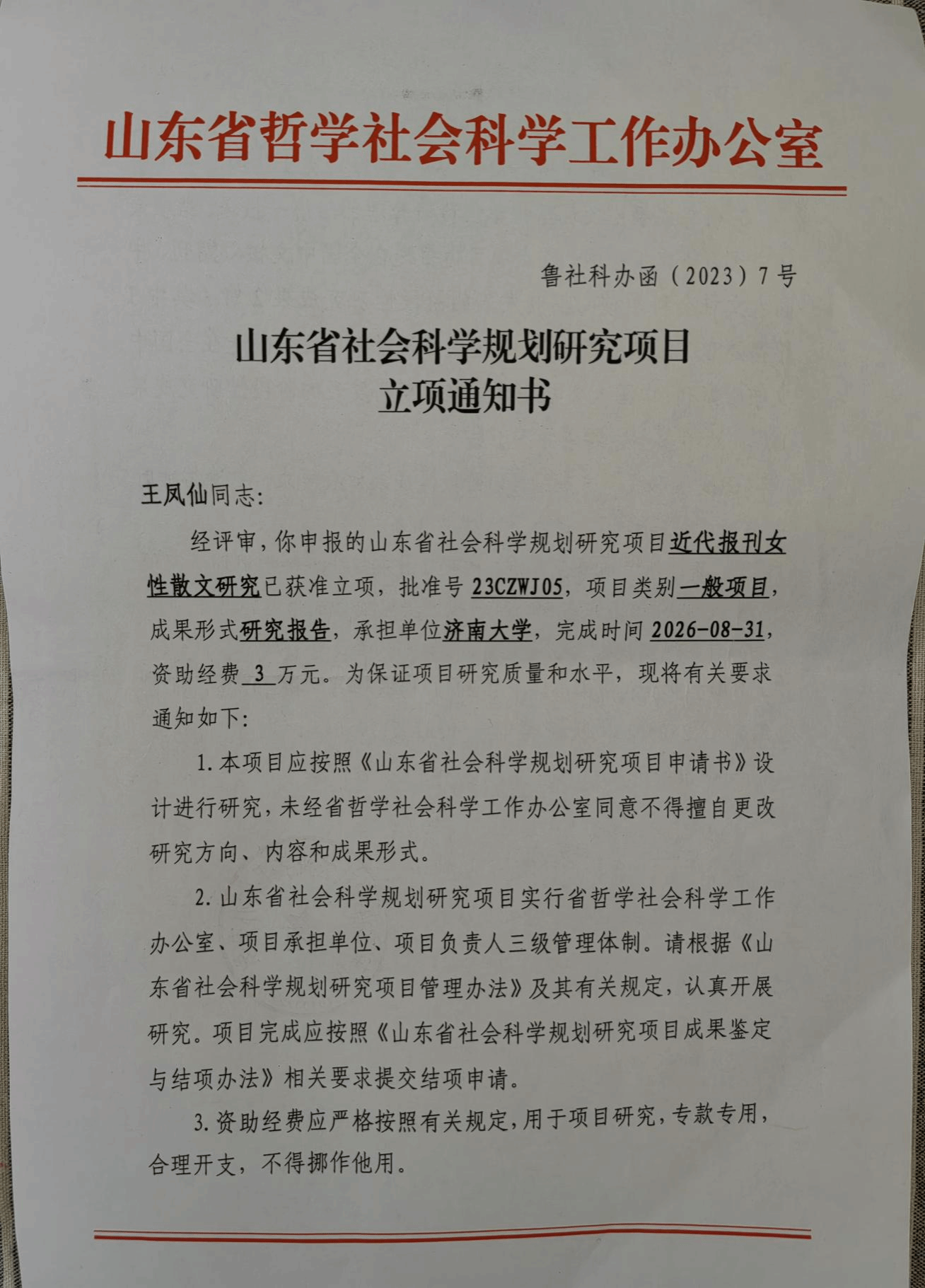 王凤仙教授主持的省社科项目《近代报刊女性散文研究》(在研):近代报刊中的女性散文数量庞大,本课题拟对近代报刊中的女性散文进行系统梳理与研究。在文献整理的基础上,对近代报刊中的女性散文进行系统梳理,勾勒出近代报刊女性散文的整体面貌,并进一步考察近代报刊女性散文的文化内涵、精神特质、文体特点及其文学史价值与意义,从而深化中国近代文学、女性文学的研究。